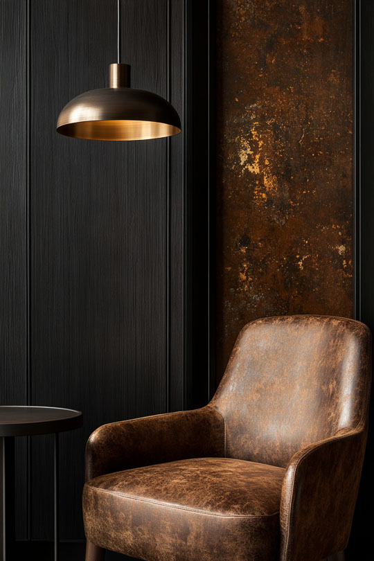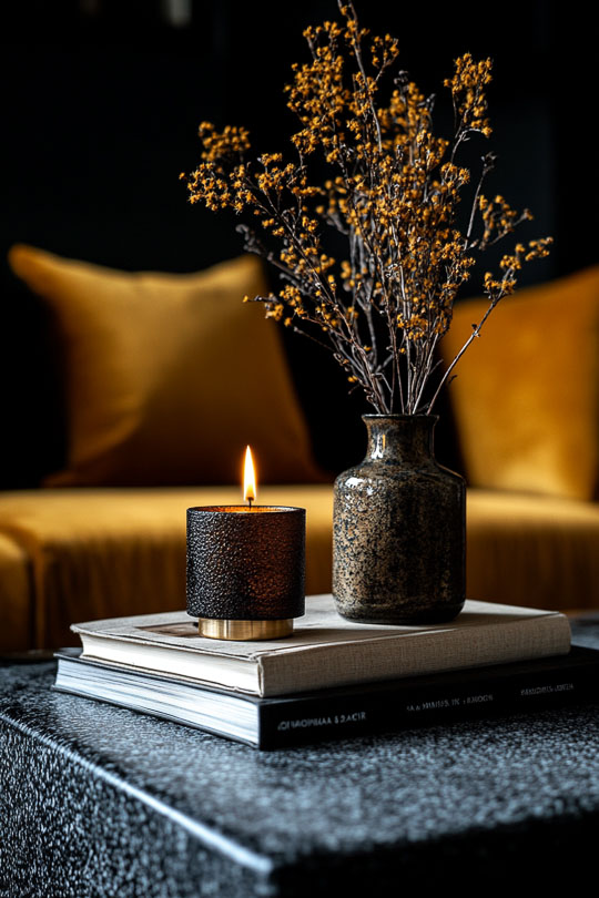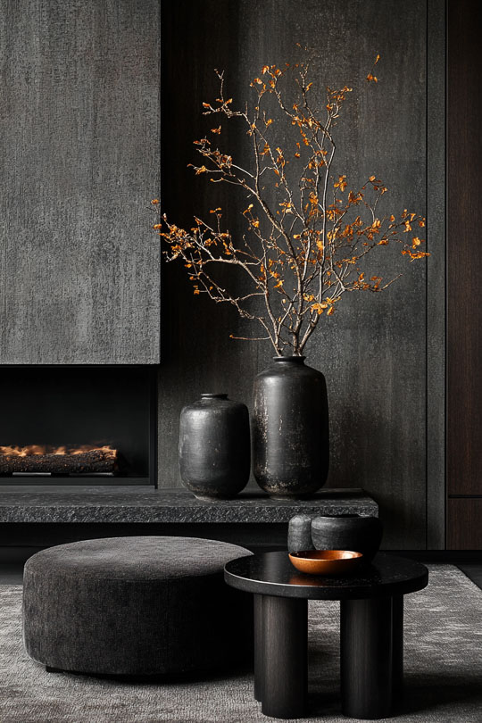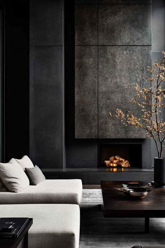 interior design magazine editorial wide-angle photograph, strong film grain. nordic interior design Autumn 2034. Minimalist interior, dark moody and cozy, books, natural fabrics, comfort, amber white black –chaos 10 –ar 2:3 –raw –profile pntonh3 –stylize 200 –v 6.1 Job ID: 95e9de28-216f-4623-9a6e-903454936a6f