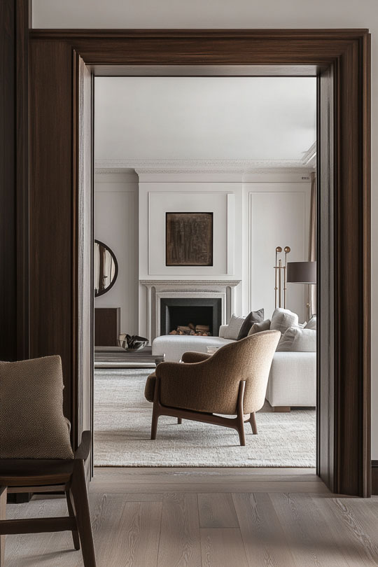 Luxurious modern New York apartment, with a minimalistic design featuring dark wood and fabric accents. The white walls are adorned with a wide door frame in the hallway, and the room includes a sofa, chair, armchair, fireplace, a large wall mirror, and lamps –ar 2:3 –v 6.1 Job ID: 1b43d51e-9300-45d8-812e-f86db082a829
