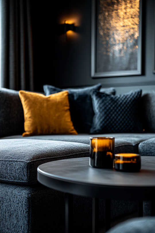 magazine editorial wide-angle photograph, strong film grain. nordic interior design Autumn/Winter 2034. Minimalist interior, moody and cozy, natural fabrics, indigo amber white black –chaos 10 –ar 2:3 –raw –profile pntonh3 –stylize 200 –v 6.1 Job ID: ca3e7bd7-b56c-4e1f-9d39-f19549deceef