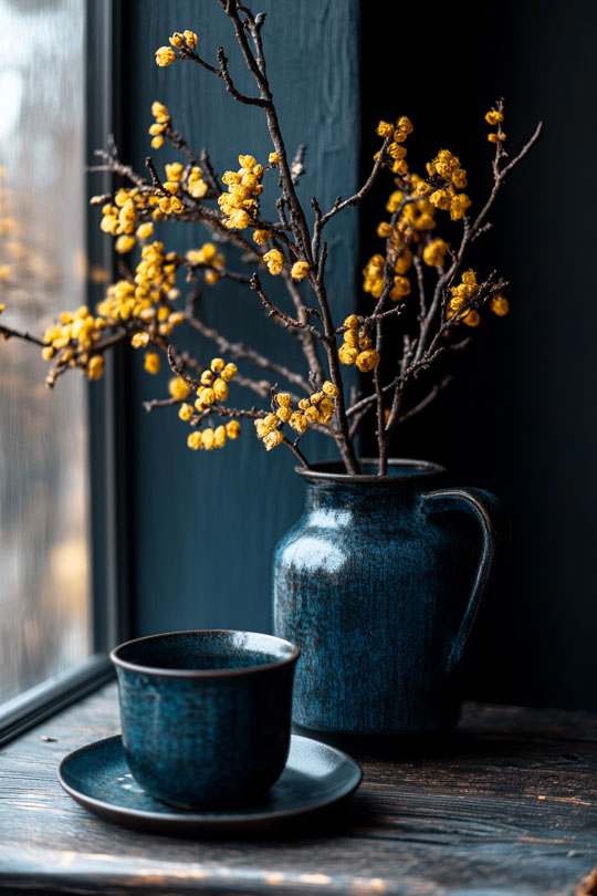 magazine editorial wide-angle photograph, strong film grain. nordic interior design Autumn/Winter 2034. Minimalist interior, moody and cozy, natural fabrics, indigo amber white black –chaos 10 –ar 2:3 –raw –profile pntonh3 –stylize 200 –v 6.1 Job ID: aa942e64-cb1e-4adf-860a-0ee162463400